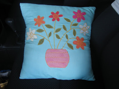 This pillow is soooo cute! I think the appliqued flowers DO look very nice:) I especially like the color combination of this pillow - light aqua, red, white, green... feeling of spring!!