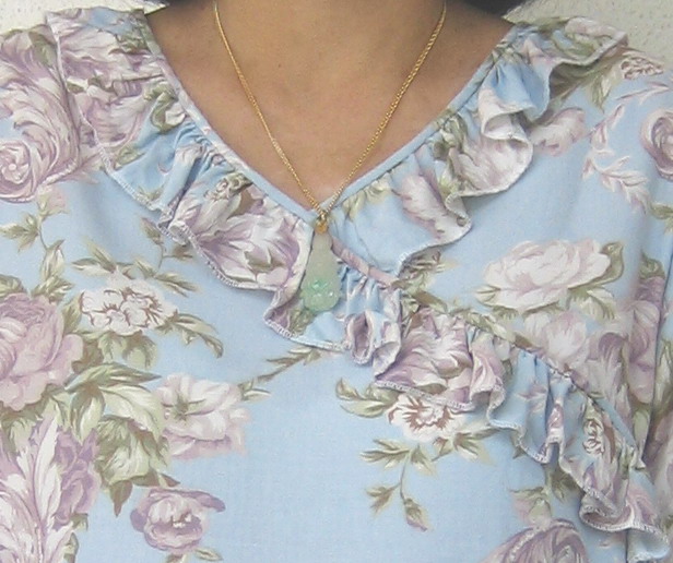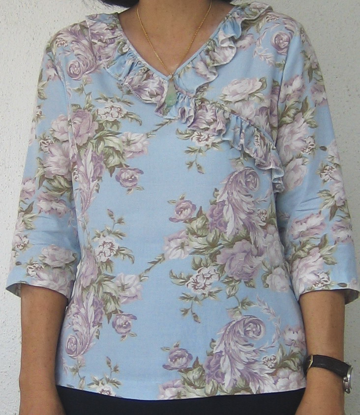 Floral print with blue background . I love the colour and the flowers .I used this fabric to made this feminine blouse , ruffled at front. The fabric is soft and very comfy to wear .